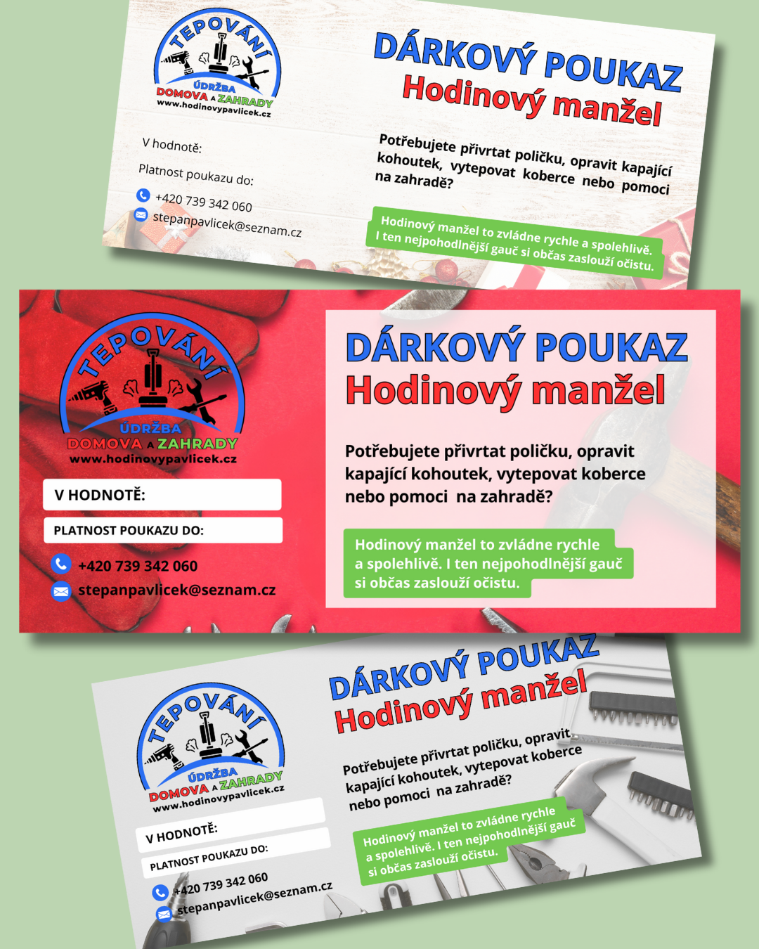 Obdarujte své blízké darem, který pomůže. Pomohu přivrtat poličku, opravit kapající kohoutek, vytepuji koberce, sedačku nebo pomohu na zahradě.